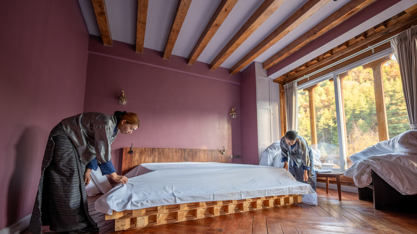 From the moment you arrive, you'll notice how harmoniously the colors, textures, and décor come together. The traditional dzong-style roofs, arched windows, and mud-plaster finishes echo centuries of Bhutanese artistry, while the interiors provide the relaxation and functionality of a modern retreat.